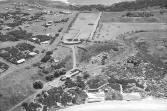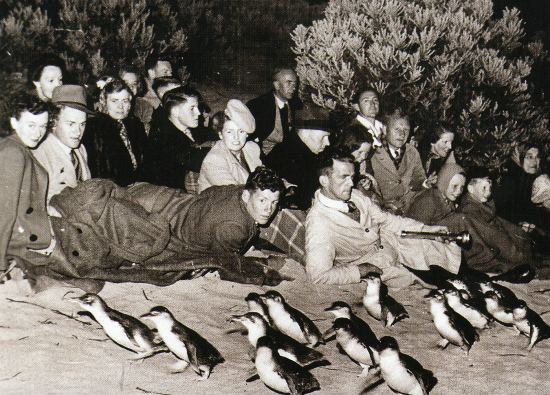 Phillip Island residents Bern Denham, Bert West, and Bert Watchorn began taking tourists by torchlight to see the little penguins’ nightly arrival on the beach at Summerland Peninsula. The first access road was built in late 1927, followed by construction of a golf course, and Summerland Peninsula was divided into 774 housing allotments. |