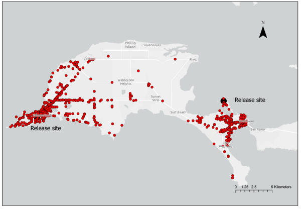 Across the three nights at Churchill Island, there were 70 captures of 42 individuals, 62% of which were seen for the first time, and at Fishers Wetland there were 26 captures of 15 individuals, 93% of which were seen for the first time. Free feeding was also conducted at Fishers Wetland to improve capture rates, resulting in almost twice as many captures compared to our spring trapping session. Many bandicoots caught across this session were in poor condition, presumably due poor food availability caused by low rainfall over the preceding weeks.