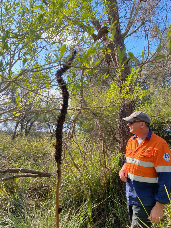 Image 12: Ranger Mark next to a small grass tree flower spike.