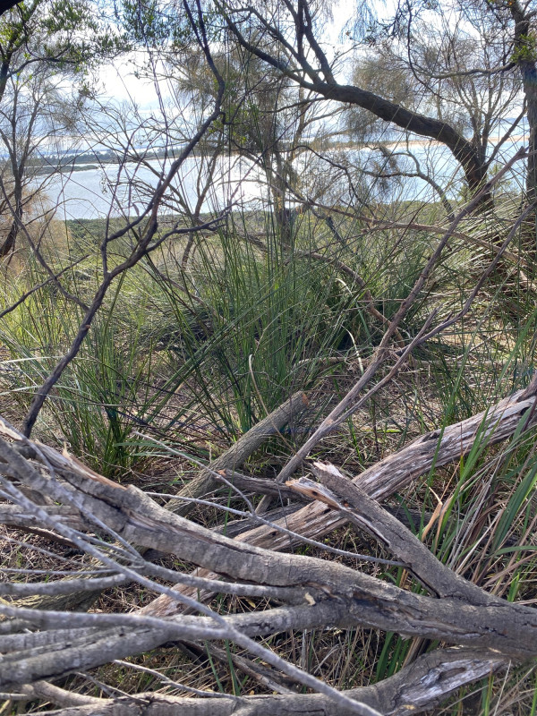 Browsing of flower spikes and foliage by wallabies has been evident on the small grass trees, Xanthorrhoea minor subsp lutea, overlooking Rhyll Inlet. A few isolated individuals have had wire guards installed to protect against herbivory, but guarding each individual or fencing off the whole population would be a difficult task due to the topography of the site. To redirect wallabies around the densest cluster of small grass trees, rangers have filled gaps and created barricades with dead casuarina and tea-tree branches. Whilst this will not completely exclude the wallabies, gathering amongst the small grass trees should be less attractive and may reduce the extent of browsing. The brushing may also provide protection for any seedlings that might germinate.