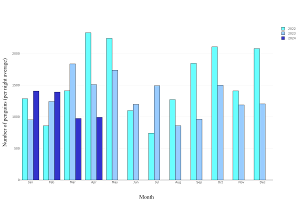 Average nightly crossings at the Penguin Parade in January and February 2024 were higher than in 2023, with 1407 vs 1285 penguins crossing per night. In March and April, however, the average nightly numbers of penguins crossing the beach were significantly lower than previous years, with a 47% decrease in March crossings and a 57% decrease in April. This could be due to large numbers of birds spending time at sea foraging after finishing breeding and moulting seasons. During May, some very healthy, well-fed-looking penguins were observed in the colony, ahead of the autumn breeding attempt.
