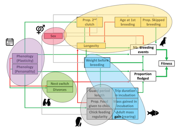 Figure 2: Theoretical path modelling illustrates the relations between foraging, chick investment, breeding behaviour, longevity, phenology, mating behaviour, and sex. Negative associations indicated by red arrows, positive by green. It focuses on breeding success and fitness influenced by these factors.