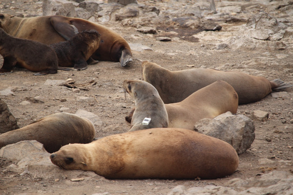 Nine fur seals at Seal Rocks have been fitted with trackers temporarily glued to their backs (see image 5). This allows for comparison of the behaviour between seals entangled in marine plastic and healthy seals of the same sex and size. The trackers measure activity via an accelerometer, temperature and depth recorder, and location via GPS.