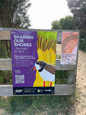 The new ‘Sharing Our Shores’ signage was placed at all the main beach access point on 1 December and the program will run until 30 April 2024. The colourful signage showcases artwork by local school students who participated in last year’s poster competition. It encourages beachgoers to share the beach with nesting wildlife.