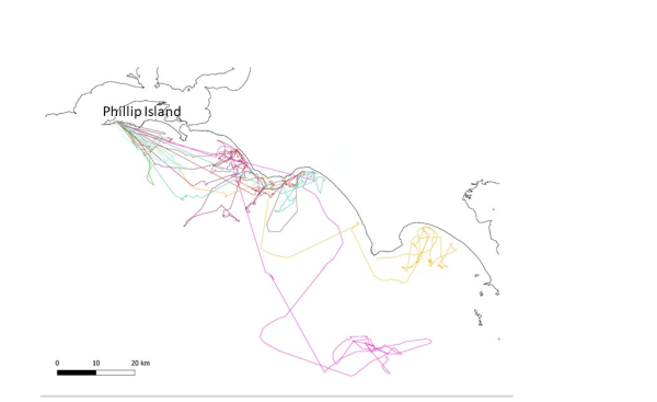 Figure 2: Penguin tracking 2023 season. The lines are tracks of penguins from the Penguin Parade travelling long distances from Phillip Island.
