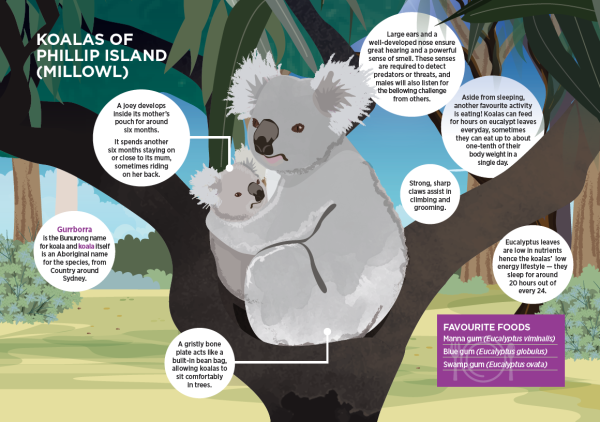 Koalas are marsupials, which are mammals that give birth to very undeveloped babies who then complete development in a pouch. Their natural habitat is the mainland of eastern Australia, but today they can also be found on several different islands like Phillip Island and French Island where they were brought across to protect them from hunting in the 1800s.
