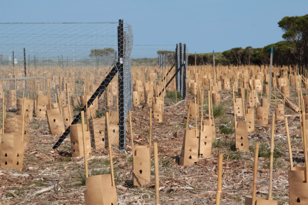 The browsing exclusion trial is a feature of the ‘Future-Proofing Little Penguins’ project and newly established green firebreaks. It exists as a series of fenced and unfenced plots installed at the time of planting and was designed to allow assessment of the impact that browsing animals, including swamp wallabies, Cape Barren geese, brushtail possums and rabbits, have on the conservation plantings, and the environment more generally. Animal browsers can significantly influence the type and form of vegetation that grows, as shown on the Summerland Peninsula. But this impact has not been previously measured in any meaningful way on the peninsula.
